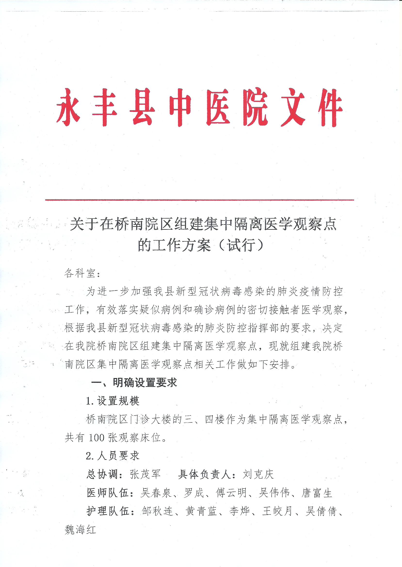 关于在桥南院区组建集中隔离医学观察点的工作方案(试行)